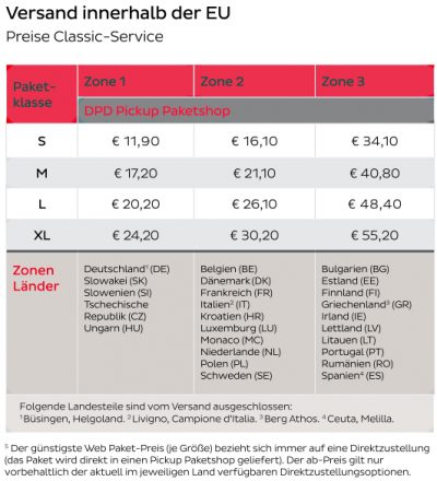 DPD-SHOP-PREIS ERMITTELN: Zentimeter der längsten + kürzesten Seite addieren und in der Preisliste (siehe unten) nachschauen. Achtung: Gurtmaß max. 300 cm (Gurtmaß = 1x längste Seite plus 2x Höhe plus 2x Tiefe)!